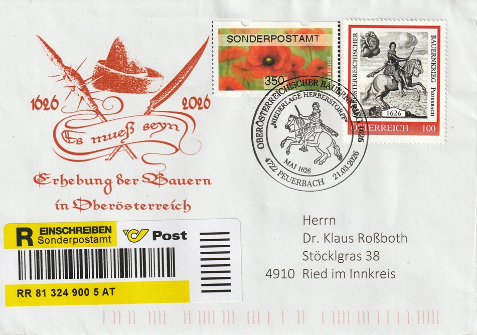 ![]() gelaufener Reco-Brief mit PM 1.Bauernkrieg-SoPo Peuerbach und SoPo-Automatenmarke € 5,50 (KR) |