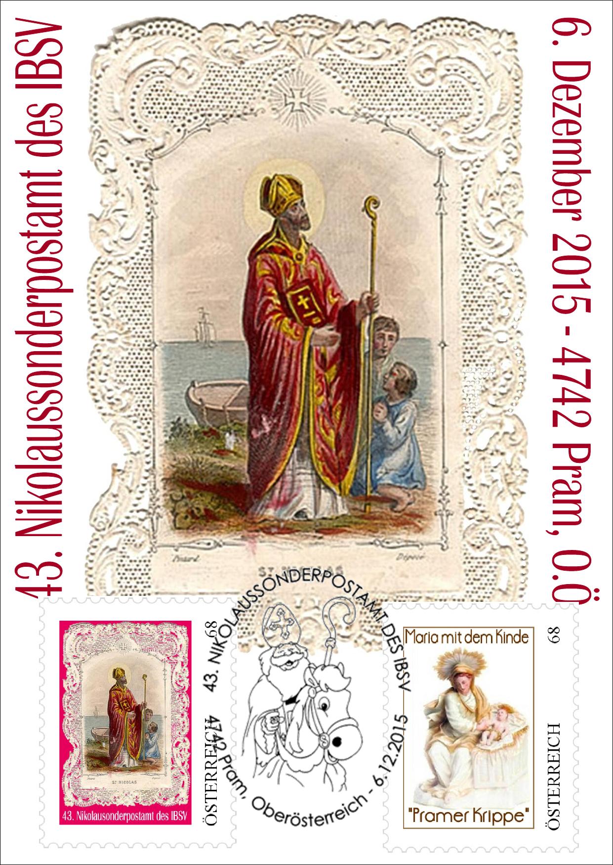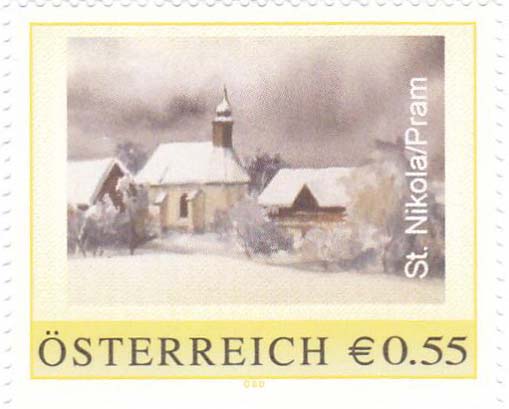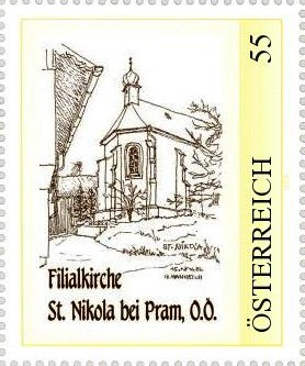 | Die drei Personalisierten Marken und | Inhalt: Geschichte der Filialkirche St. Nikola, Leben des hl. Nikolaus mit Legenden und Darstellung in der "Philatelie-Kunst", | persönliche Weihnachtsmarke von Herbert Gruber |