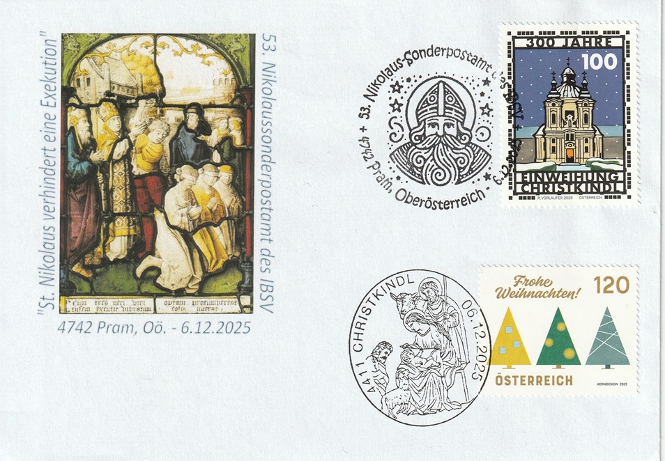 ![]() Kuvert "Nikolaus 2025" mit beiden WM 100+120c € 3,00 (IBSV 3) |
