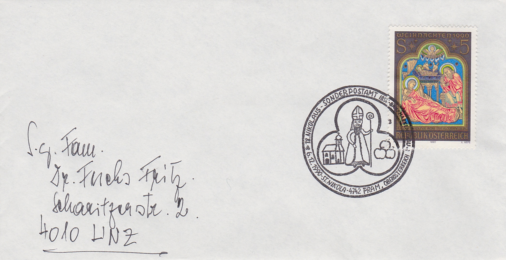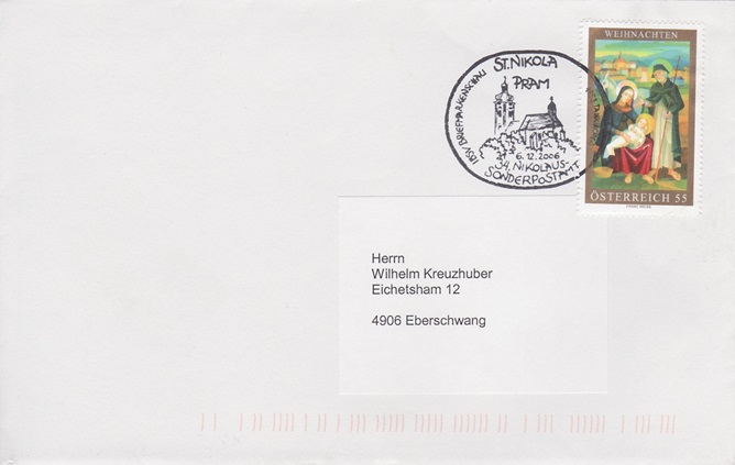![]() gelaufenes Schmuckkuvert mit Weihnachtsmarke und Nikolausstempel € 4,50 (KR) |