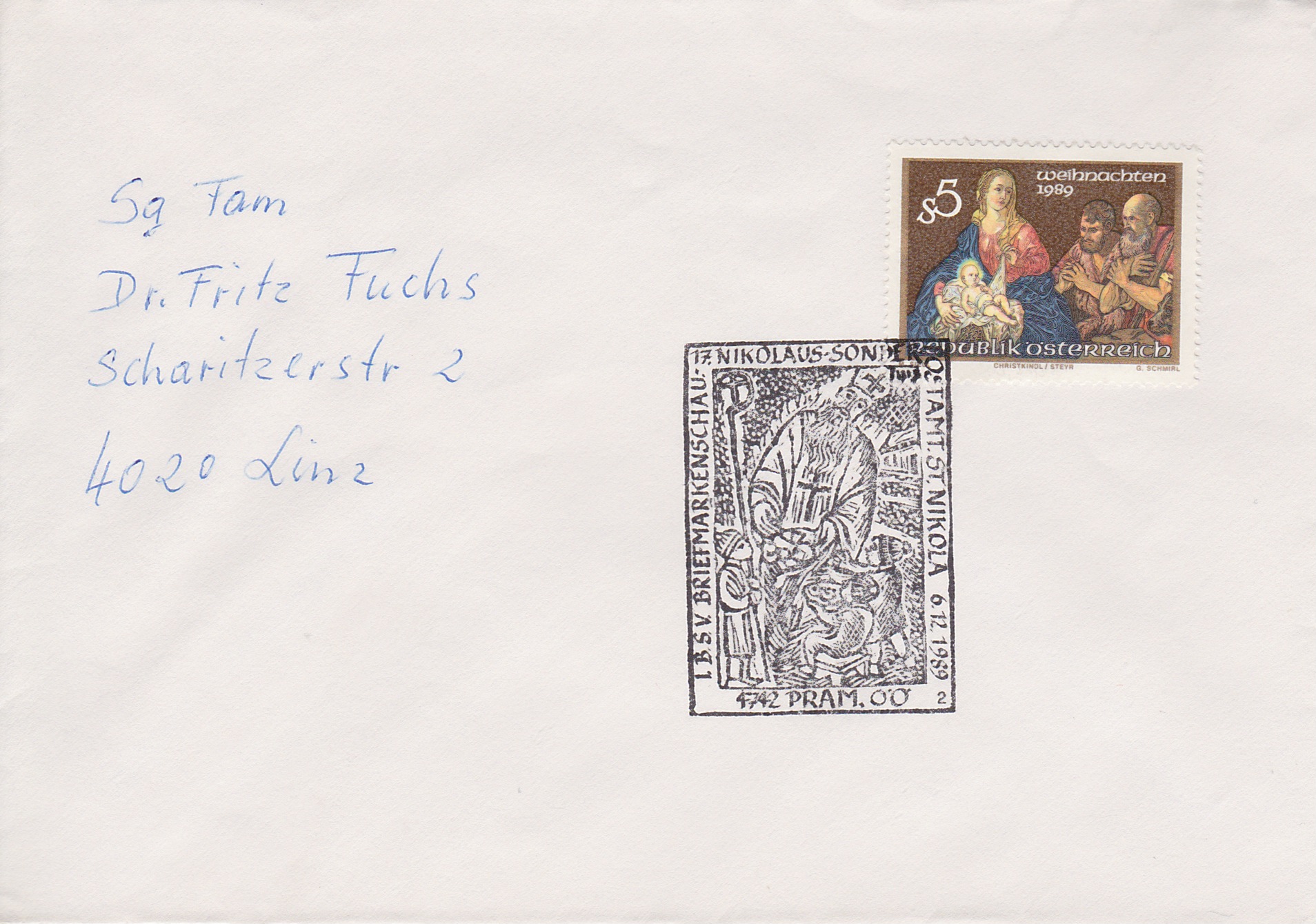 ![]() Einzelstück Kuvert mit Weihnachtsmarke und Nikolausstempel € 4,50 (KR1 + wk) |